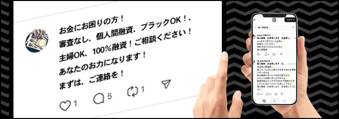 SNSを使ったヤミ金は、一見すると普通の個人がお金の貸し借りを行っているように見えるのが特徴です。「#個人間融資」などのハッシュタグで検索すると、簡単にお金を貸してくれる人が見つかりますが、そのほとんどがヤミ金業者です。